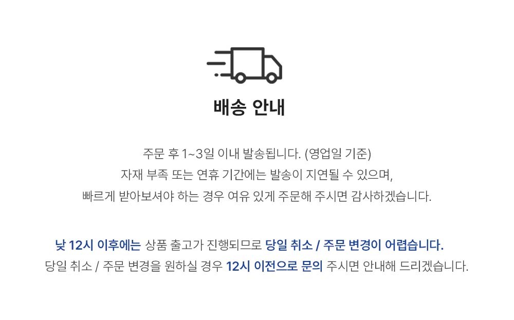 ▪︎ 배송 업체에 특별한 상황(노조 파업 등)이 발생된 경우, 배송 지연을 막기 위해 택배사가 변경될 수 있습니다.